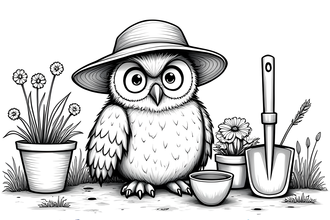 A nature-themed coloring page featuring an owl gardening. Includes various gardening tools and plants with moderate detail.