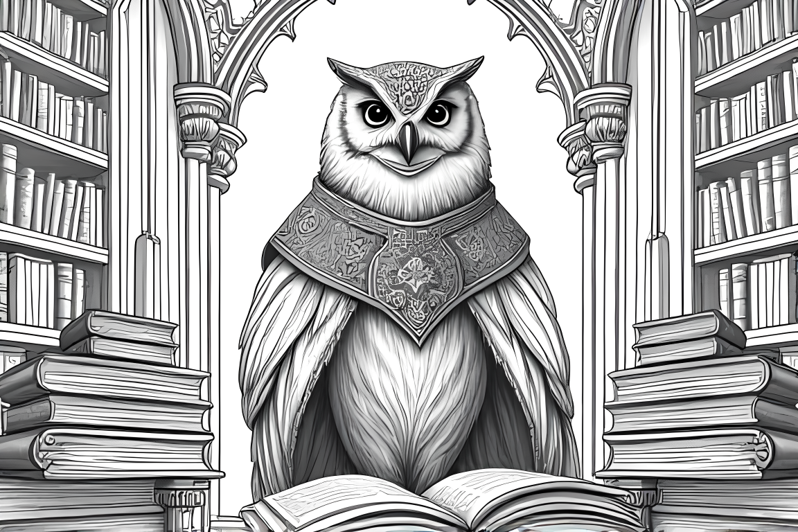 A detailed coloring page of an owl as a medieval scholar in an ancient castle library. Features intricate architectural and historical elements.