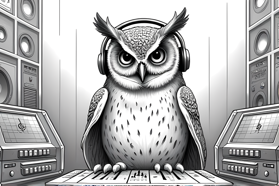An intricate coloring page showing an owl composer in a professional music studio. Features detailed musical elements and equipment.