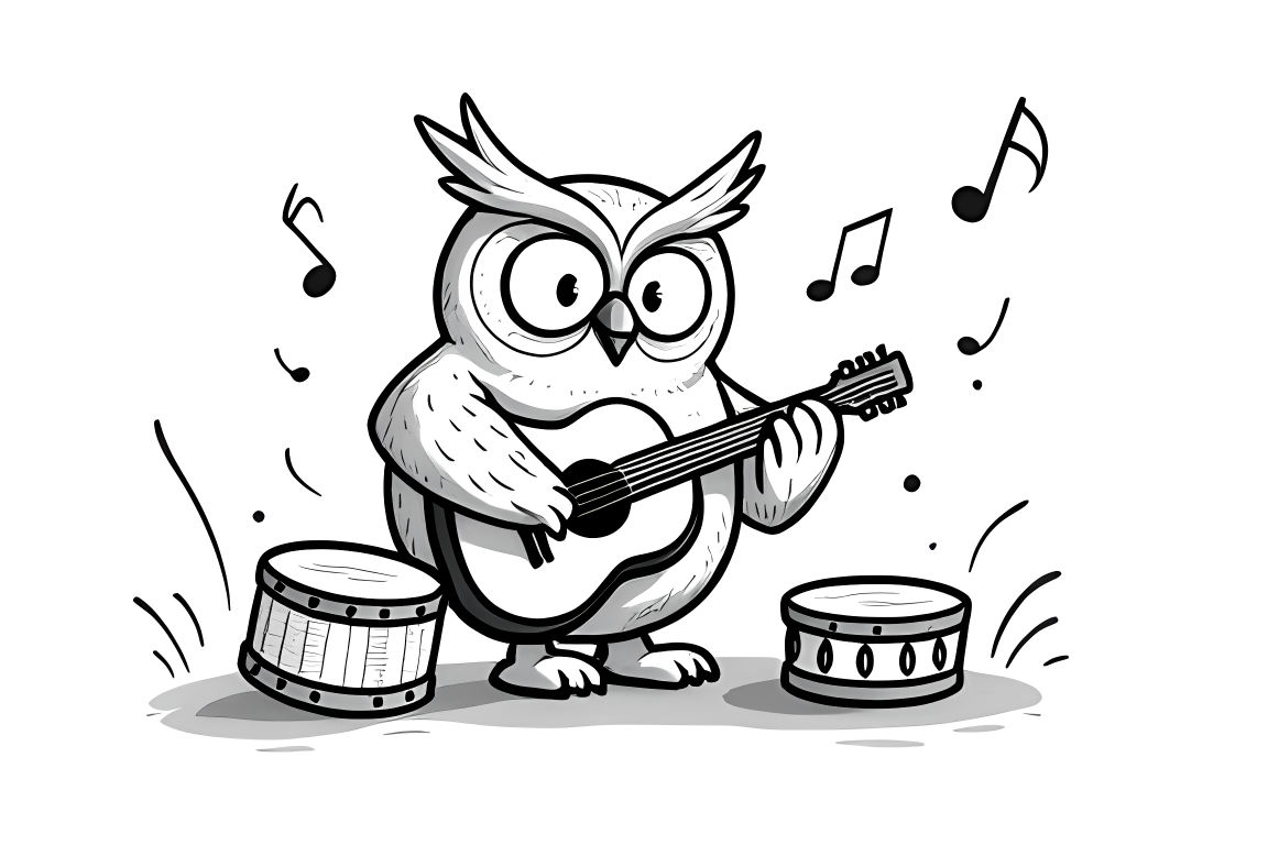 A fun coloring page of an owl playing musical instruments. Includes moderate details perfect for developing coloring skills.