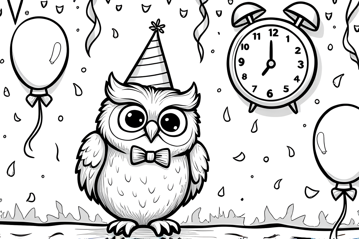 A sophisticated owl hosts a New Year celebration with party decorations and a clock approaching midnight. This detailed coloring page challenges older children while maintaining fun holiday spirit.