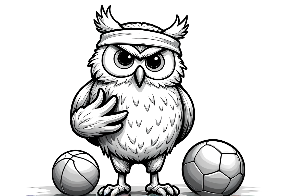 An active coloring page featuring an owl playing sports. Includes various sports equipment with moderate detail.