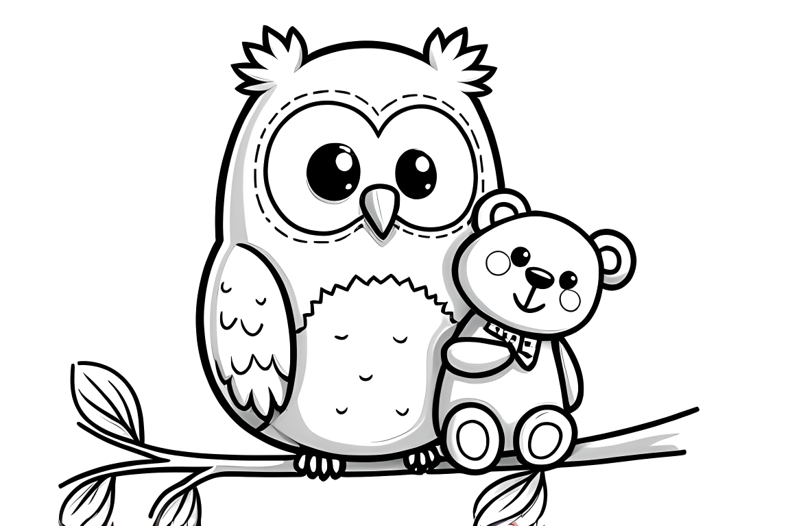 A sweet coloring page showing a small owl hugging its favorite teddy bear. Designed with simple shapes for young children to enjoy.