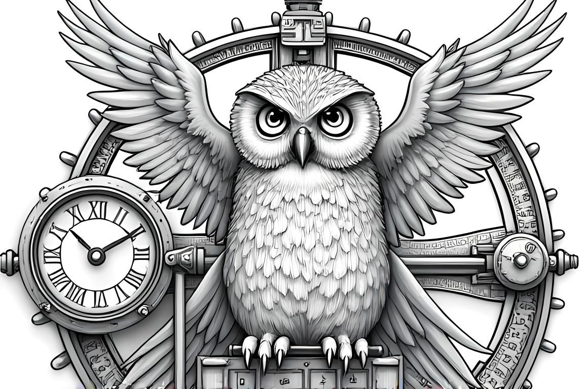 A complex coloring page showing an owl operating a time machine. Features intricate steampunk elements perfect for older children.