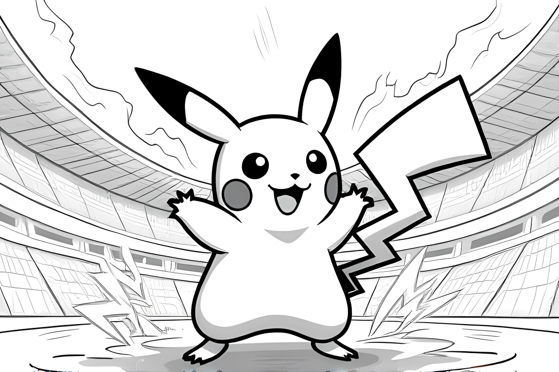 An advanced coloring page showcasing Pikachu in a dynamic battle pose. Features more complex details while maintaining clear coloring spaces.
