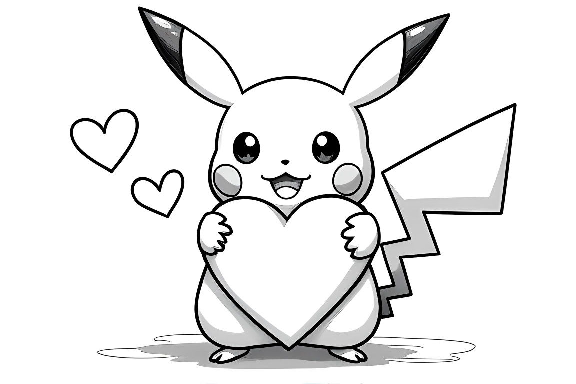 A heartwarming coloring page of Pikachu holding a large heart shape. Perfect for young children with its simple design and clear outlines.