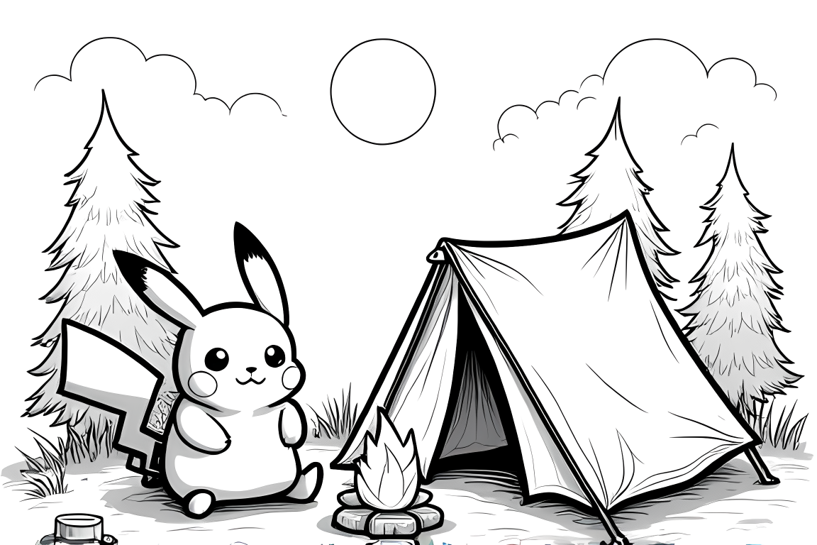 An outdoor-themed coloring page with Pikachu camping. Includes various camping elements while maintaining good coloring spaces.