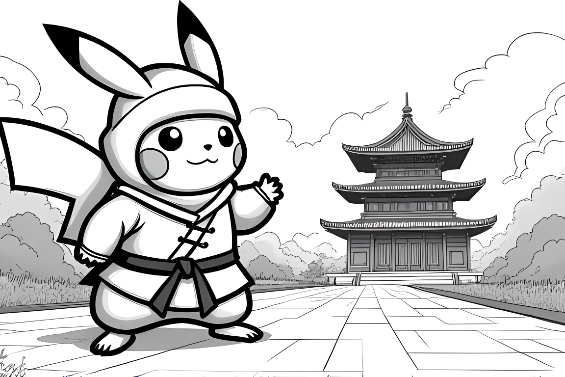 An action-packed coloring page showing Pikachu as a ninja. Features more complex martial arts elements and Japanese-style details.