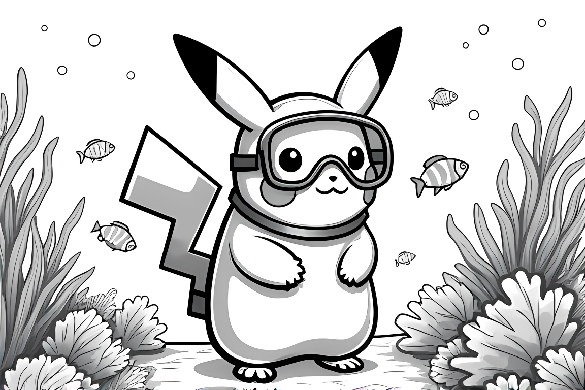 An elaborate underwater scene featuring Pikachu in diving gear. Includes various sea creatures and underwater elements for advanced coloring.