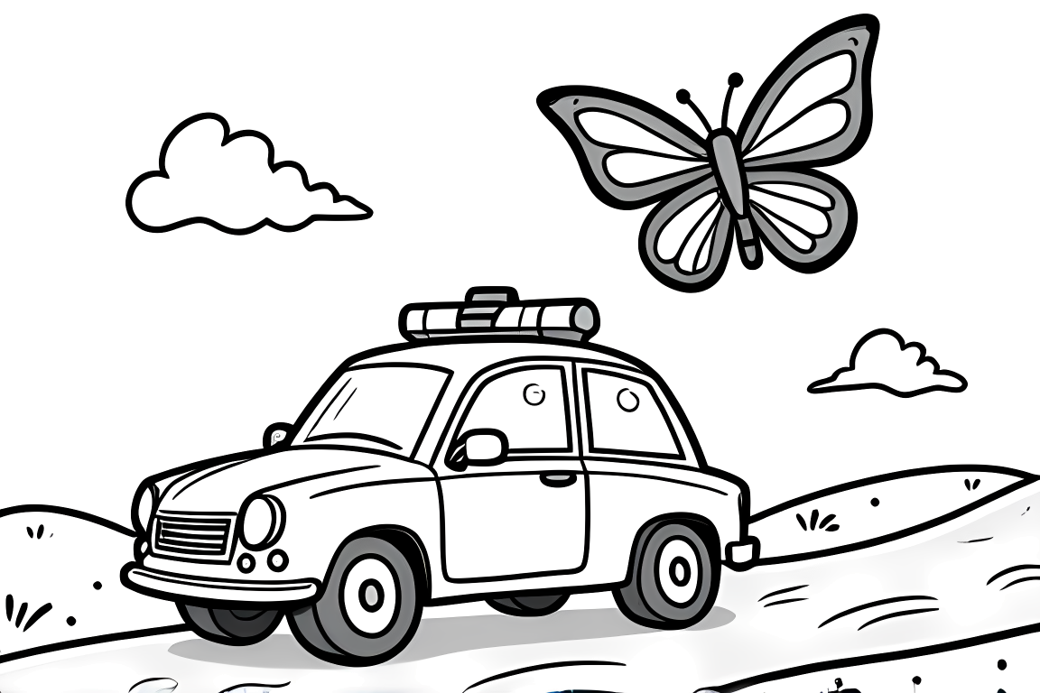 A delightful coloring page showing a police car watching a large butterfly float by. The simple design and basic shapes make it perfect for young children's first coloring adventures.