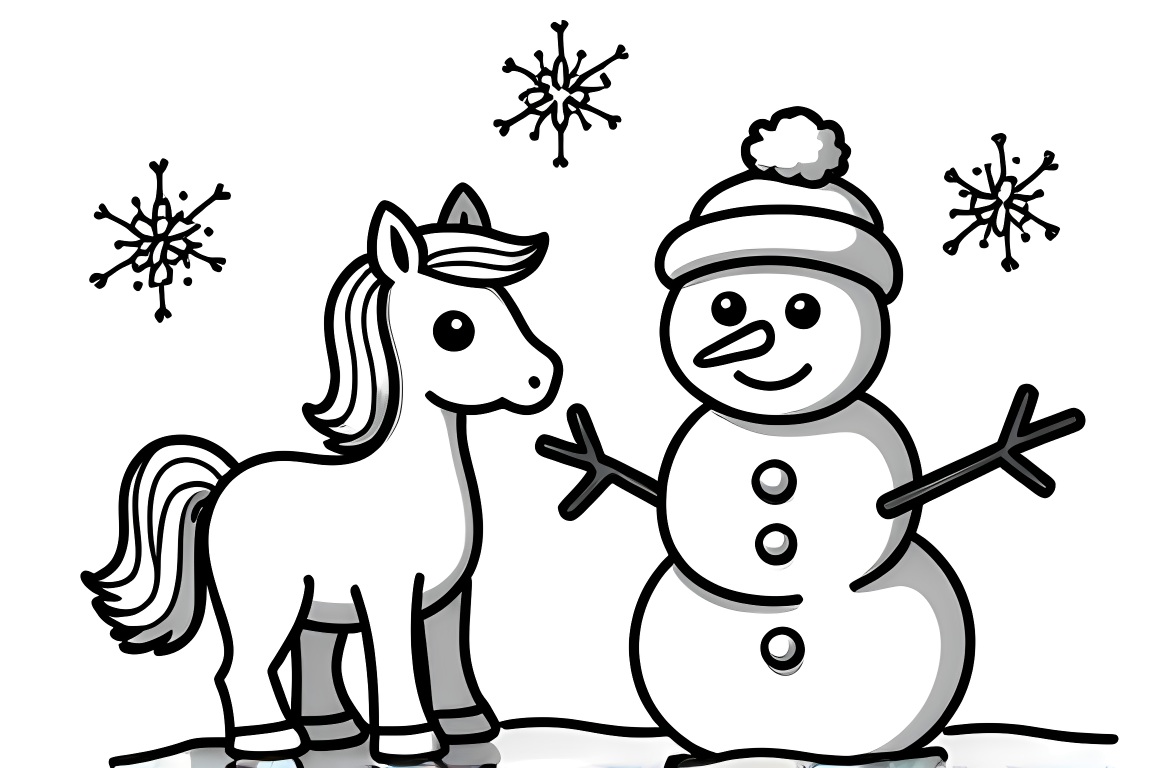 An adorable coloring page showing a small pony playing with a snowman. The basic design and large coloring spaces are perfectly suited for very young children. This festive scene helps develop early coloring skills.