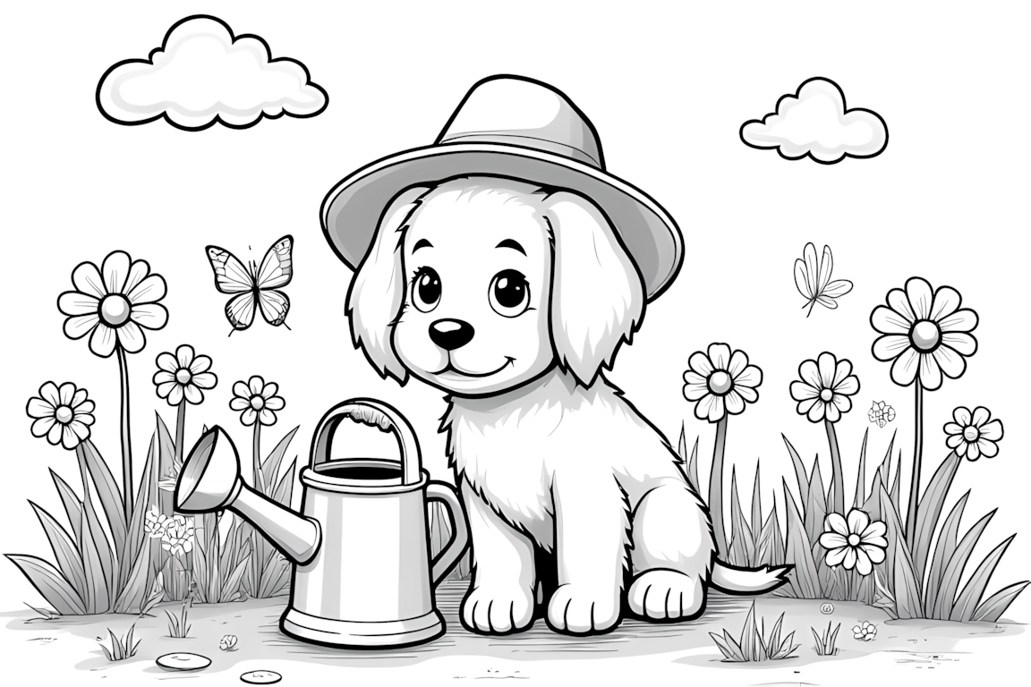 A sweet coloring page showing a puppy helping in the garden. This illustration includes multiple elements that will engage kindergarten-aged children.