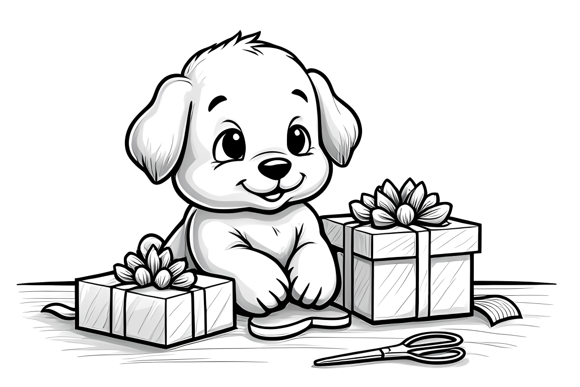 A festive coloring page showing a puppy wrapping Christmas presents. Includes some fun details while maintaining clear areas for coloring, perfect for school-age children.