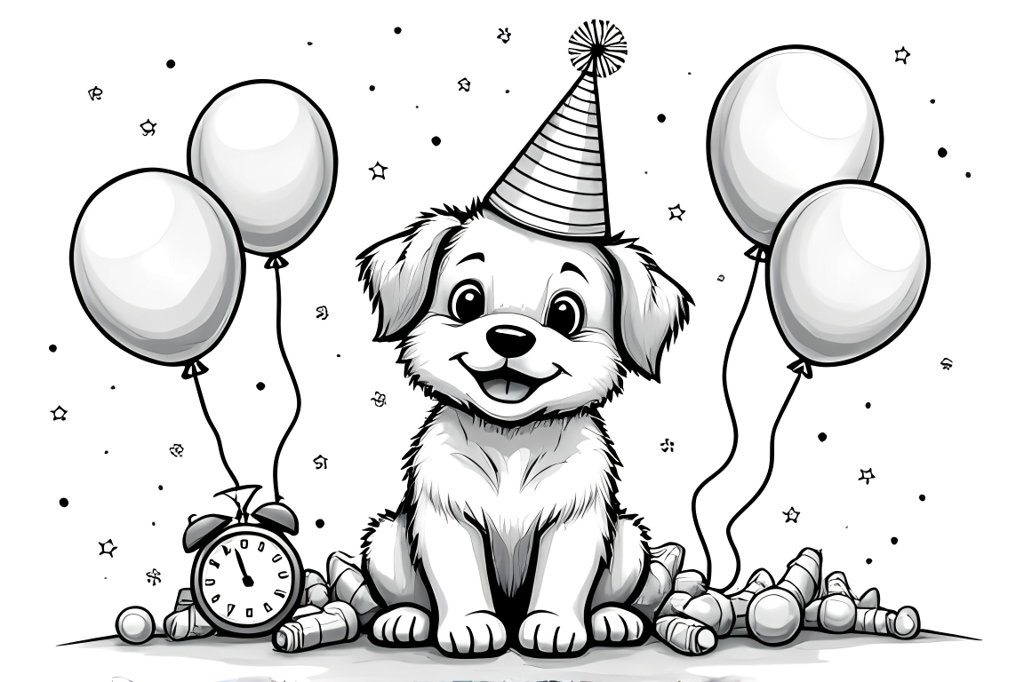 A detailed New Year's Eve scene with a puppy hosting a celebration with various party elements. Perfect for older children who enjoy more intricate coloring challenges.