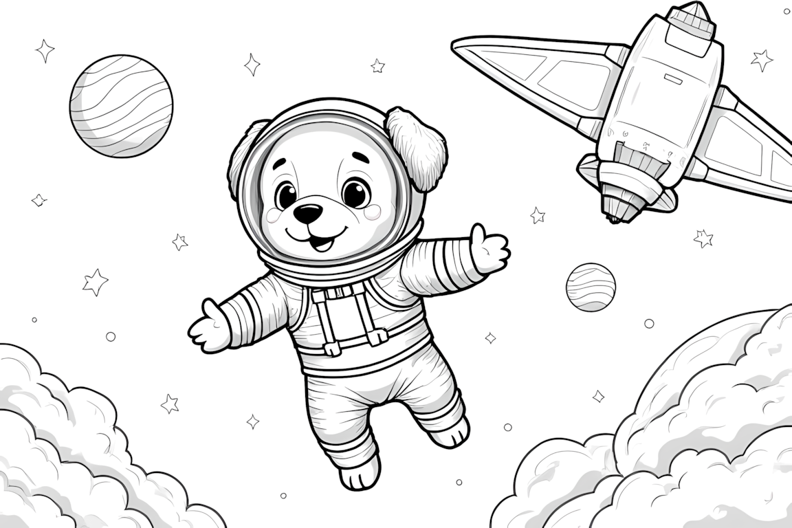 An exciting coloring page depicting a puppy astronaut exploring space. This detailed illustration challenges older children with its intricate space elements.