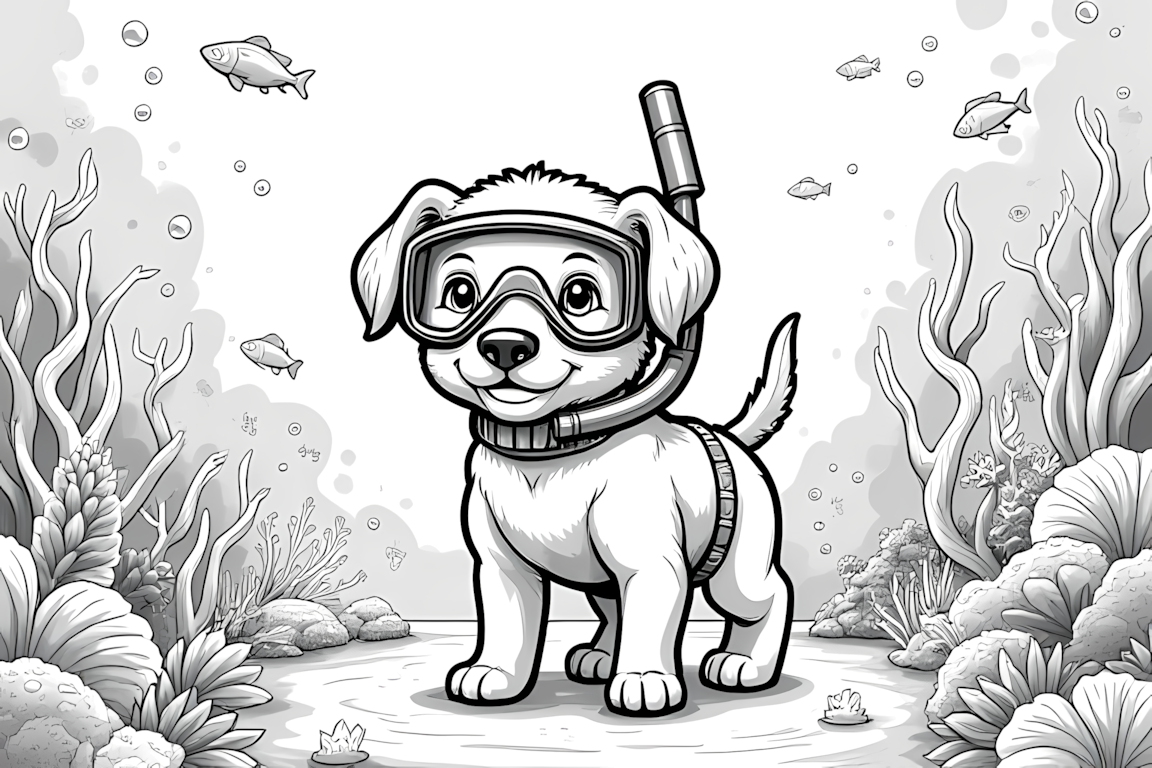 A fascinating coloring page showing a puppy scuba diver exploring the ocean depths. This detailed illustration challenges older children with its intricate marine elements.