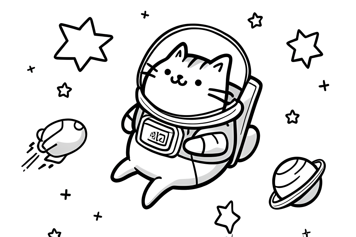 An engaging coloring page showing Pusheen as an astronaut floating in space among stars and planets. This space-themed illustration encourages creativity while making science fun for young artists.