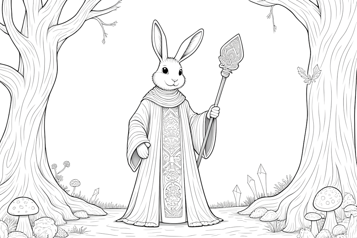 A magical forest scene with a rabbit wizard surrounded by mystical elements. Features intricate details perfect for older children.