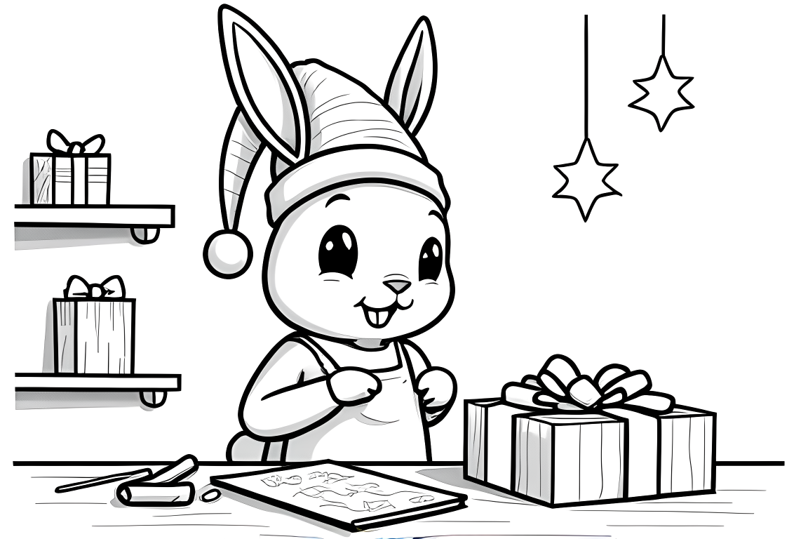 A cheerful coloring page showing a rabbit wrapping Christmas presents at a workshop table. This moderately detailed illustration is perfect for school-age children to practice their coloring skills.