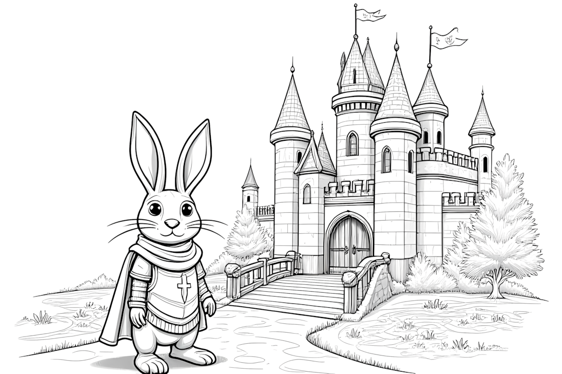A detailed historical scene of a rabbit knight guarding a medieval castle. Features intricate patterns and architectural elements suitable for older children.