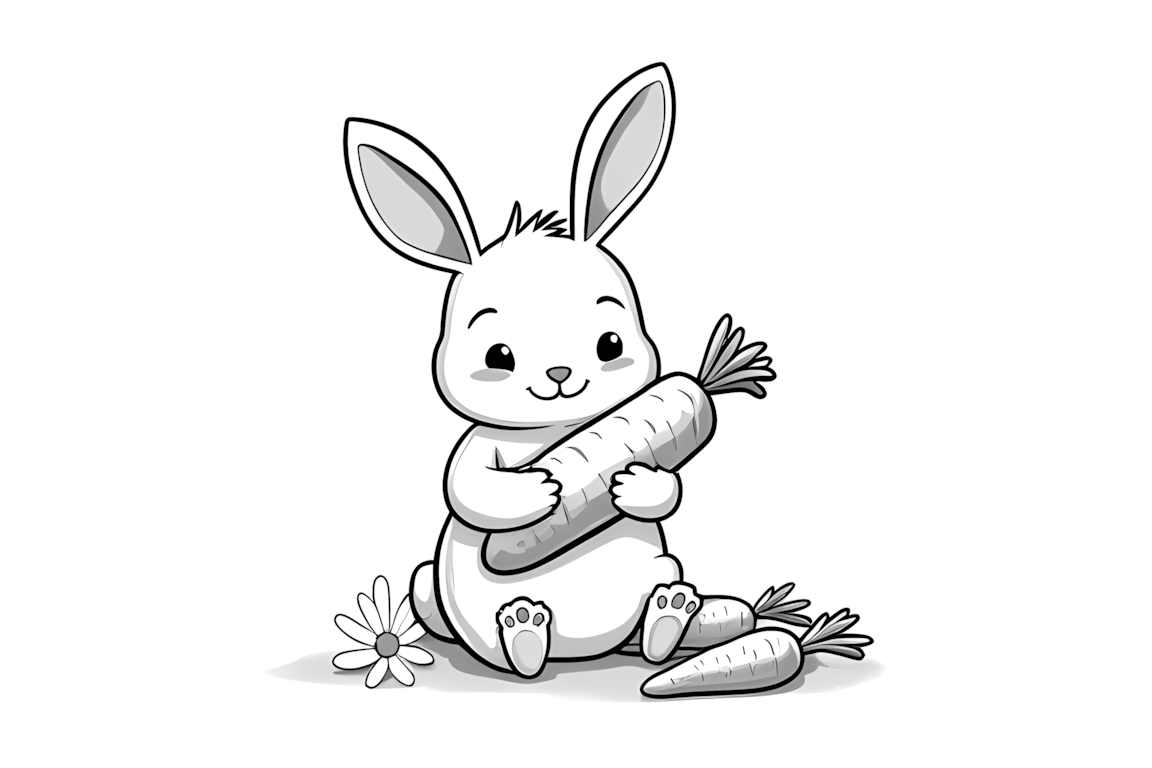 A delightful simple scene of a rabbit eating a large carrot. Features basic shapes and clear lines perfect for the youngest coloring enthusiasts.