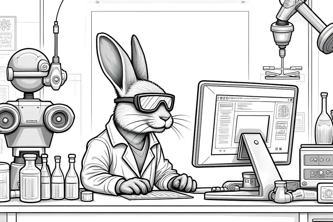 An intricate science fiction scene featuring a rabbit scientist in a futuristic laboratory. Perfect for older children interested in science and technology.