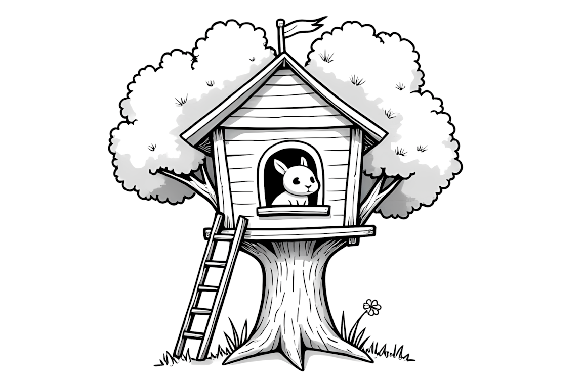 A charming illustration of a rabbit in a cozy treehouse. Features moderate details suitable for elementary school children.
