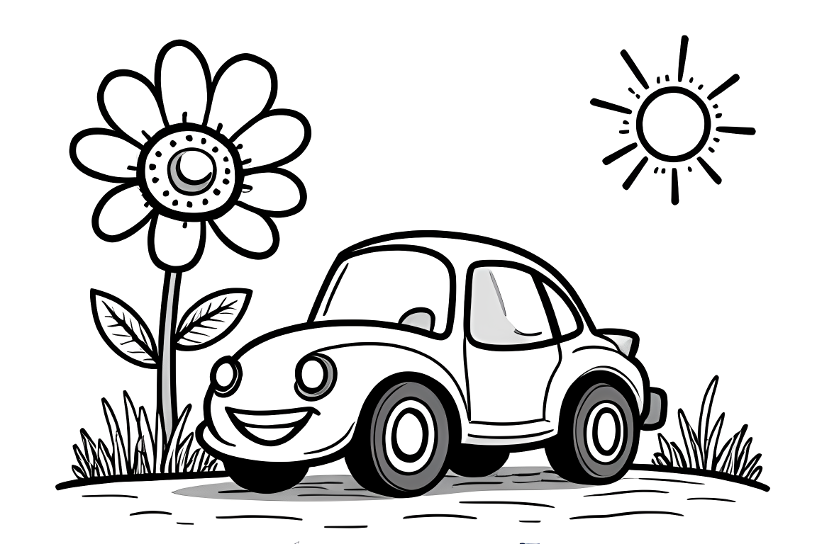 A sweet coloring page showing a friendly race car next to a large simple flower. This illustration features basic shapes and clear lines perfect for toddlers developing their coloring skills.