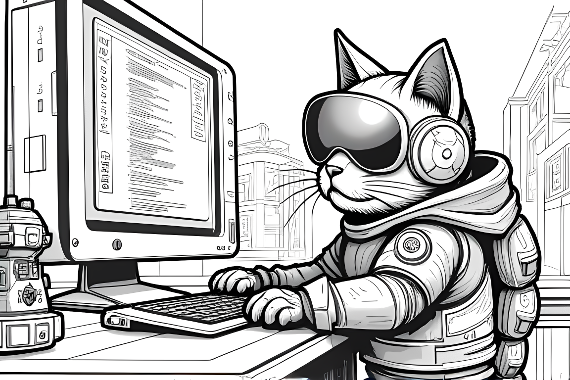 An intricate coloring page featuring a kitten building and programming robots. Perfect for older children interested in technology and engineering.