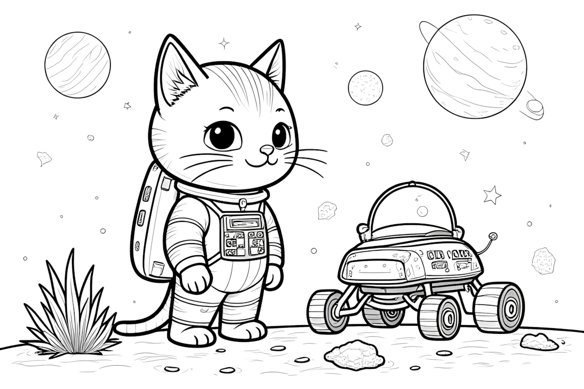 An advanced coloring page featuring a kitten astronaut exploring a distant planet. Perfect for older children with more intricate details and interesting space elements.