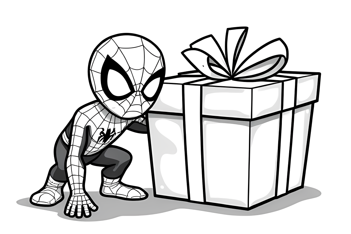 A fun coloring page featuring Spiderman with a large gift box. The basic shapes and clear outlines are perfect for toddlers' first coloring adventures.