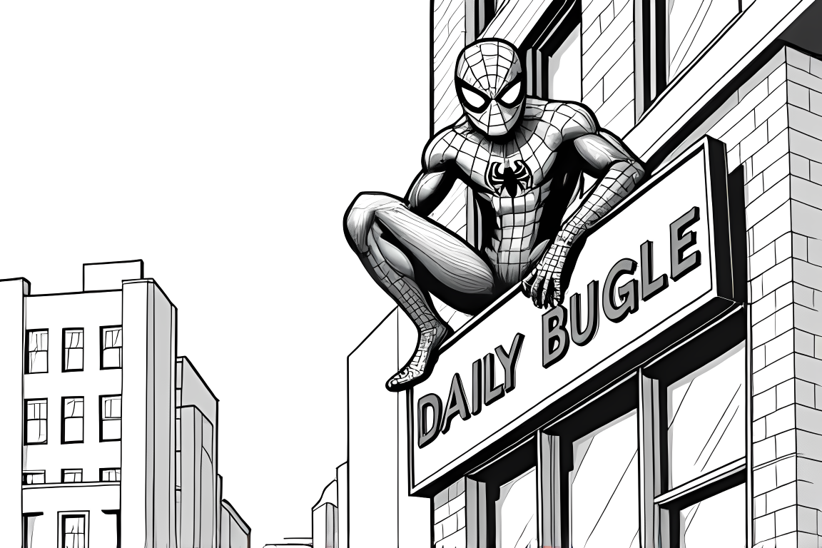 An interesting coloring page featuring Spiderman near the Daily Bugle building. The architectural elements provide engaging details for school-age children.