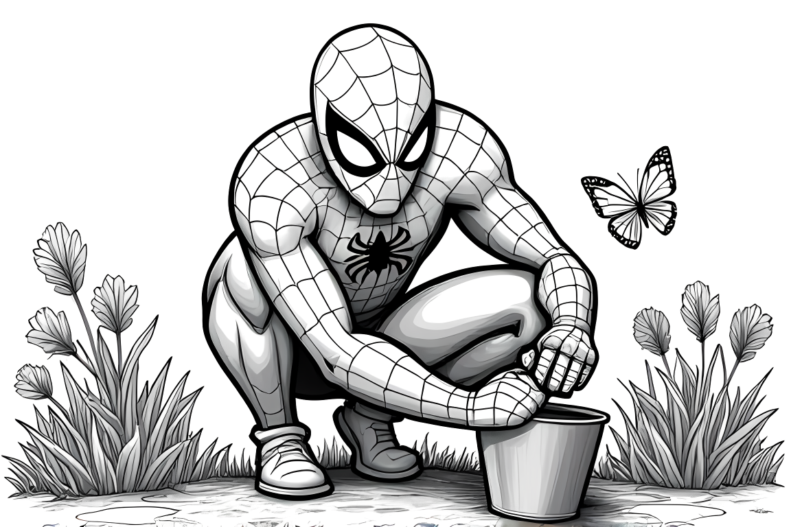 A peaceful coloring page featuring Spiderman in a garden setting. The natural elements provide interesting details for school-age children.