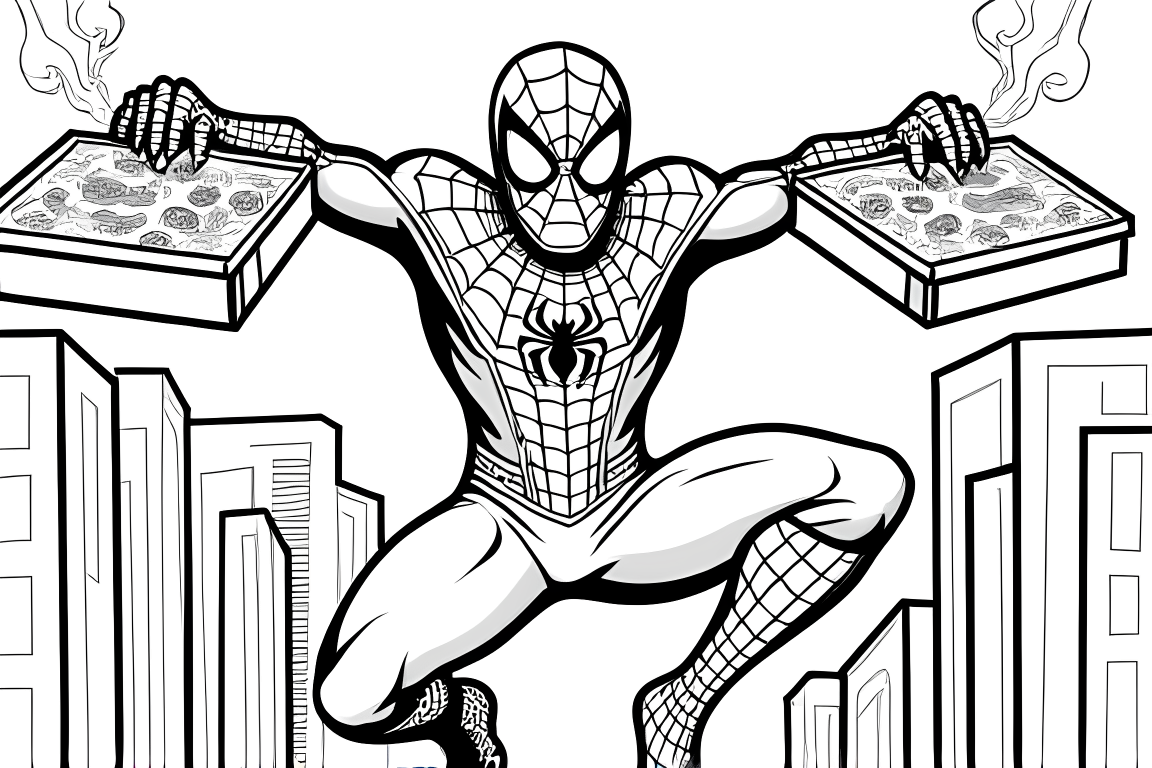 A fun coloring page showing Spiderman delivering pizza. The food-themed elements make it entertaining for school-age children.