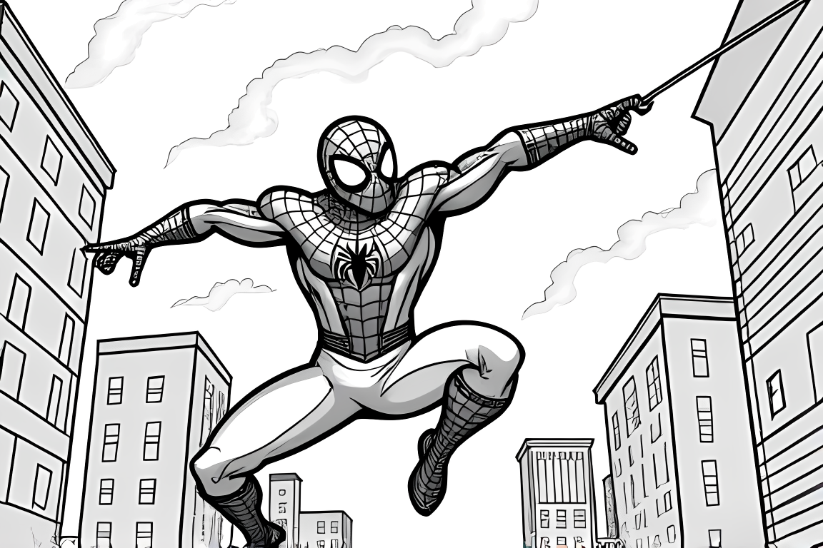 A dynamic coloring page showing Spiderman creating web patterns. The moderate complexity provides a fun challenge for school-age children.