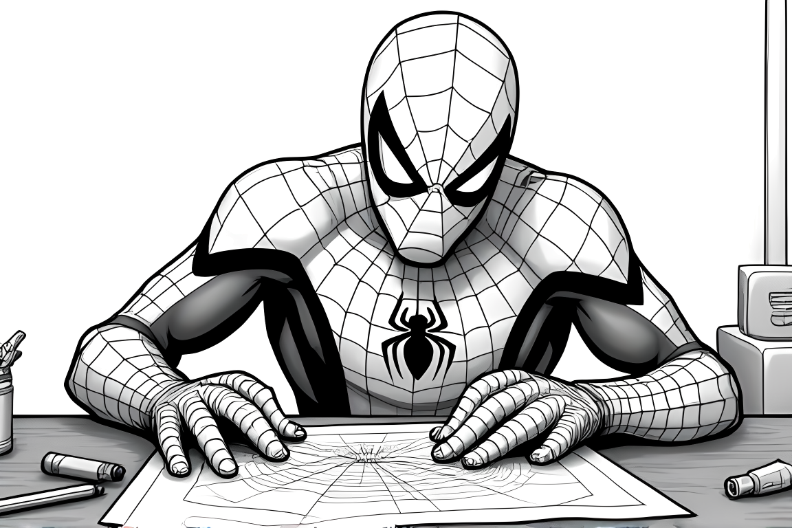 A detailed coloring page featuring Spiderman creating advanced web devices. The technical elements provide an interesting challenge for older children.