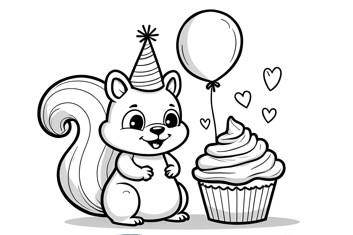 A festive coloring page featuring a happy squirrel with a birthday cupcake. The basic design and large elements make it an ideal choice for toddlers to practice their coloring skills.