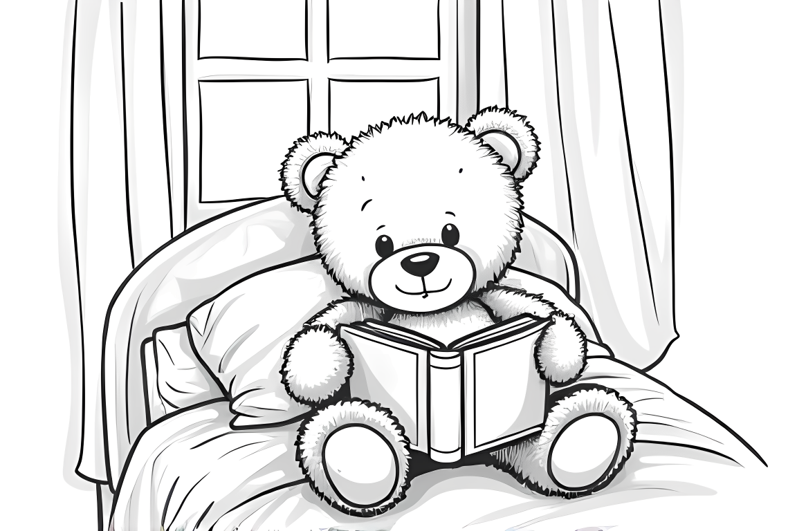 A delightful coloring page featuring a cozy teddy bear reading a storybook in bed. Perfect for toddlers learning about bedtime routines, this simple illustration helps develop early coloring skills.