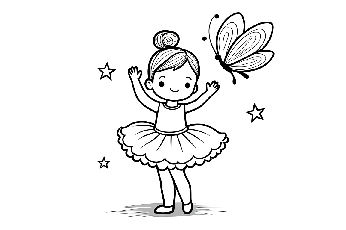 A delightful coloring page featuring a little ballerina spinning with a large butterfly nearby. Perfect for toddlers' first coloring experience with simple shapes and clear outlines that make it easy for small hands to color.