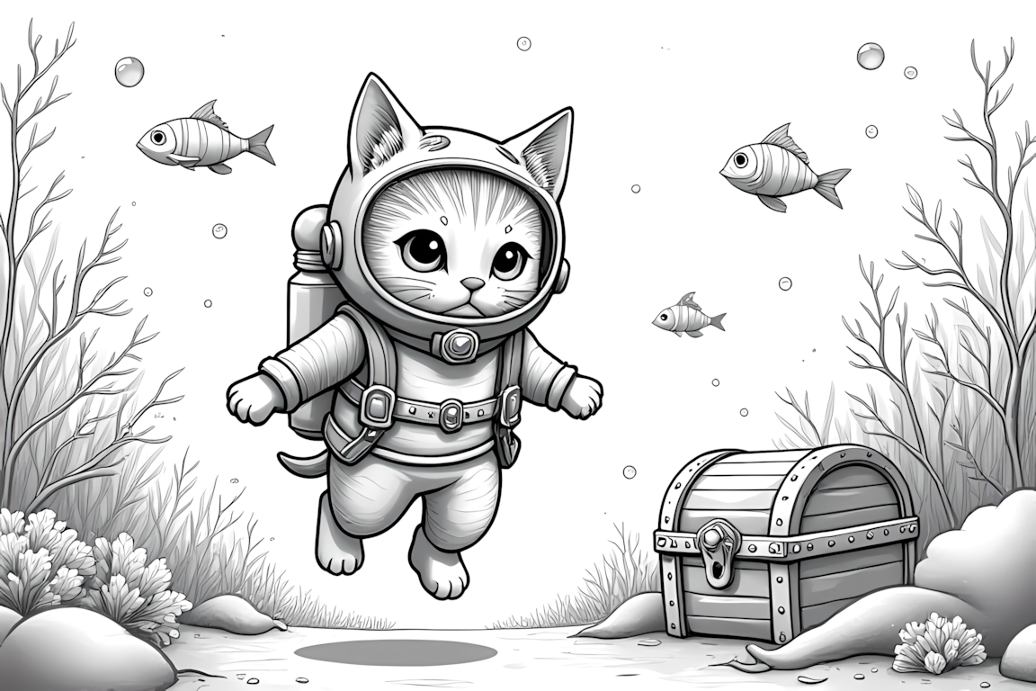 An elaborate coloring page showing a kitten exploring ocean depths. Features detailed marine life and underwater equipment for older children.