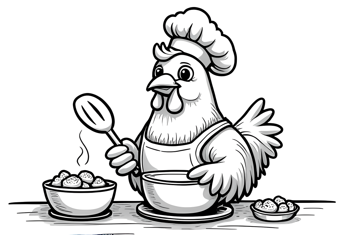 Urocza strona do kolorowania przedstawiająca kurę piekącą w kuchni. Zaprojektowana z umiarkowanym poziomem szczegółowości dla rozwijających się artystów.